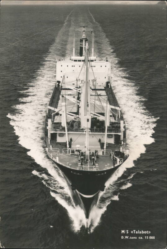 | Aerial view of the cargo ship M/S «Talabot» underway at sea, showing its bow and wake. The vessel has a deadweight of approximately 15,000 tons and is part of Wilhelmsen Lines of Oslo, Norway, with the slogan "For Speed and Service". A handwritten message on the reverse is postmarked from Kowloon, Hong Kong on October 30, 1972, and is addressed to Edmonton, Alberta, Canada. |