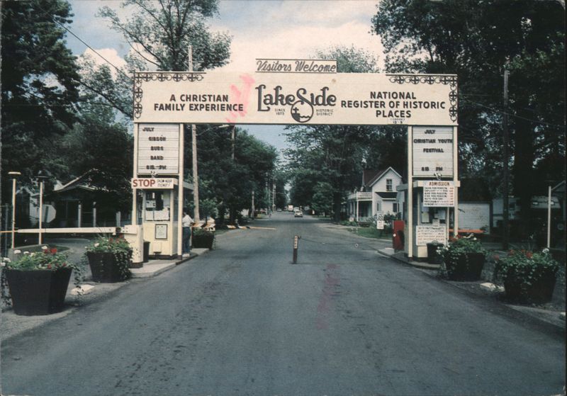 | Entrance to Lakeside, described on the sign as "A Christian Family Experience" and on the "National Register of Historic Places". The printed text on the back states: "Newly renovated, the main gate to Lakeside invites all to recreation and inspiration." |