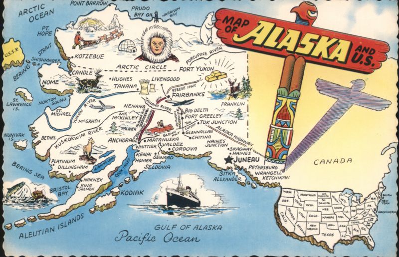 A whimsical illustrated map of Alaska highlighting major cities like Juneau, Anchorage, and Fairbanks, as well as cultural and wildlife elements like a polar bear, dog sleds, and a person in a parka. The map includes the Alaska Highway, Mt. McKinley, and a smaller inset map of the contiguous United States. The title is presented on a decorative totem pole-style sign. |