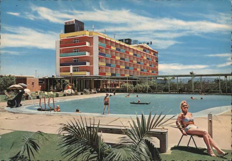 View of the swimming pool and colorful modernist facade of Lennon's Hotel. Guests are seen swimming and relaxing by the pool, with a woman in a bikini sitting in a chair in the foreground.