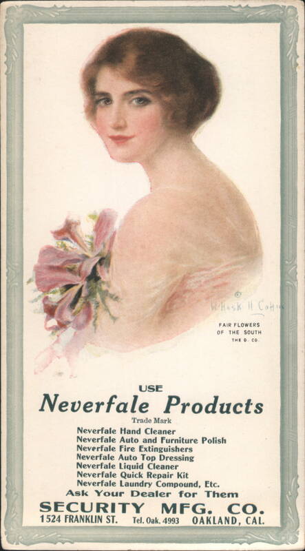 Advertisement featuring an illustration of a woman with the tagline 'Fair Flowers of the Youth'. Promoted products include: Neverfale Hand Cleaner, Auto and Furniture Polish, Fire Extinguishers, Auto Top Dressing, Liquid Cleaner, Quick Repair Kit, and Laundry Compound. Security Mfg. Co. located at 1524 Franklin St., Tel. Oak. 4993, Oakland, Cal. |