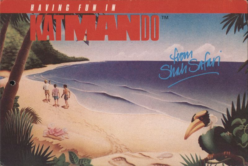 | An illustrated beach scene with three people walking on the sand by the ocean, with palm trees and a large tropical bird in the foreground. The back reads: "You won't belive the great new fashions we've seen. The look is relaxed with lots of color and the life is wild in Katmando. See you soon-". The card is signed "Shah Safari" on both the front and back. |