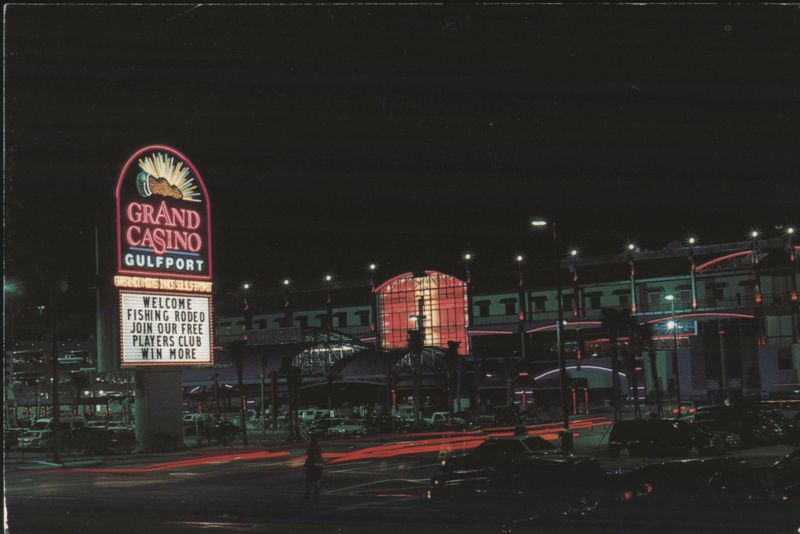 Grand Casino in Gulfport, Mississippi, featuring 1800 slot machines, 90 gaming tables, 2,000 free parking spaces, a supervised children activity center, and three restaurants. The marquee welcomes visitors to a Fishing Rodeo.