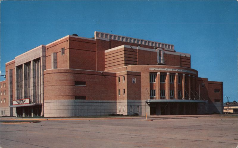 Exterior view of the Municipal Auditorium, a large brick building in the Art Deco style. The building features a prominent curved entrance with columns, and a large parking lot in the foreground.