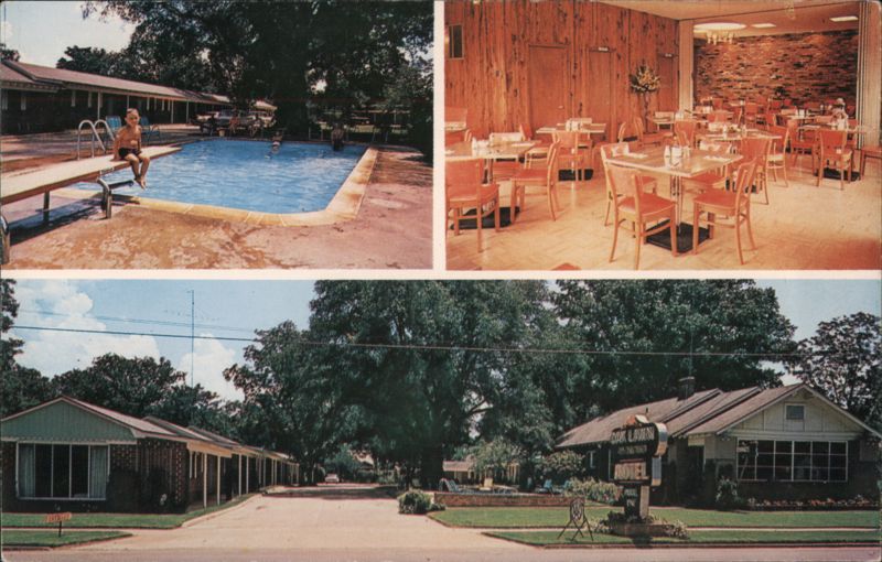 | Multi-view of the Oak Lawn Motel, showing the swimming pool with a guest on the diving board, the interior of the adjoining restaurant, and an exterior view of the motel rooms. Amenities listed are Air Conditioned, All Tile Baths, Carpeted Floors, and Television. |