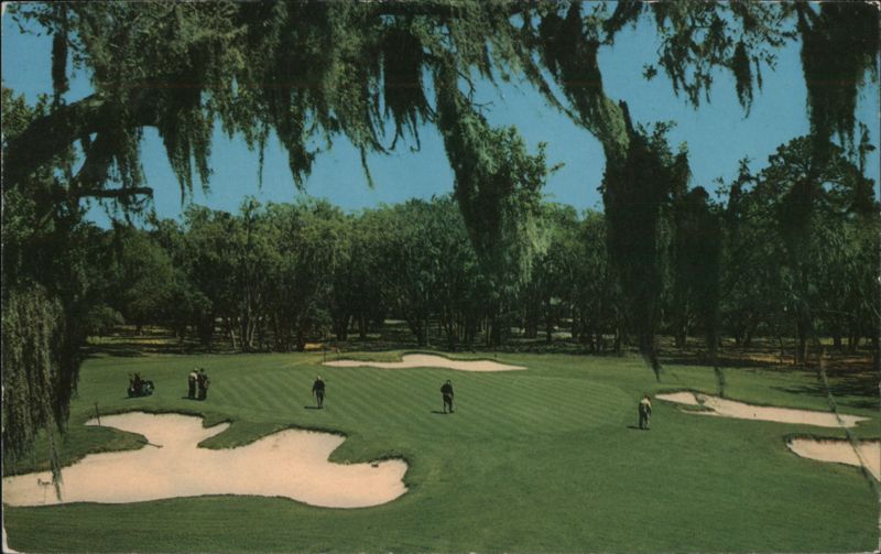 Golfers play on the fourth green of the Retreat Nine course, which is surrounded by numerous sand traps and framed by large trees draped with Spanish moss.