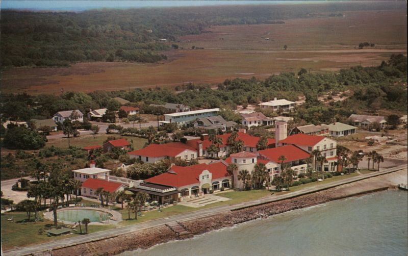 "Bird's Eye" view of the beautiful King & Prince Hotel, Saint Simons Island, Georgia. Famous for its ideal vacation appeal, where rest and entertainment prevail.