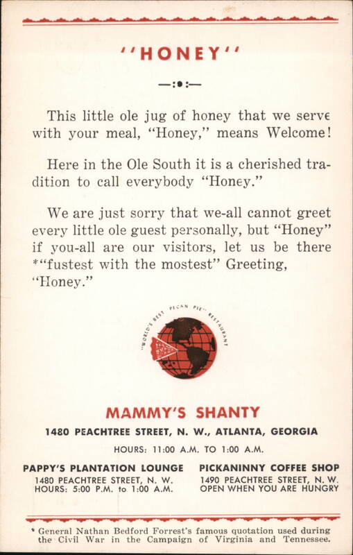 | Text describes the southern tradition of calling people 'Honey.' Features the logo for 'World's Best Pecan Pie Restaurant.' and a quote, 'fustest with the mostest,' attributed to *General Nathan Bedford Forrest. Also lists Pappy's Plantation Lounge (1480 Peachtree Street, N.W.) and Pickaninny Coffee Shop (1490 Peachtree Street, N.W.). The reverse side notes 'Southern-style cooking' with lunch from 85c to $2.50 and dinner from $1.45 to $4.50. |