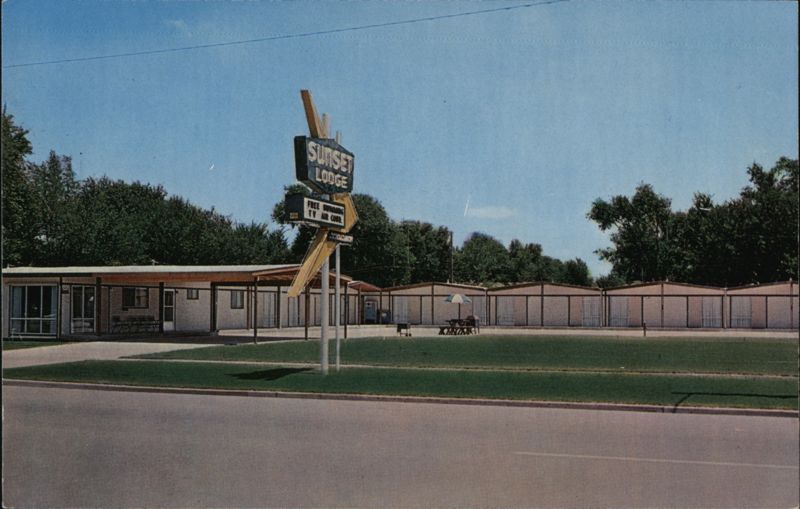 | A view of the Sunset Lodge Motel, featuring its distinctive angled sign. Proprietors were Leon & Lillian Thompson. Located on Highway K 14 - K 96, the motel was Mobil Travel Guide Recommended and featured air conditioning, free T.V., and carpeting. |