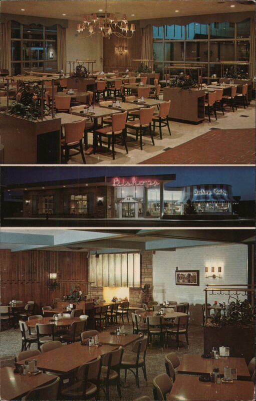 Three views of the Bishop Buffet restaurant. The top and bottom images show the interior dining areas with mid-century modern decor. The middle image is a nighttime view of the building's exterior, with neon signs for 'Bishops' and 'Bishop Pantry'.