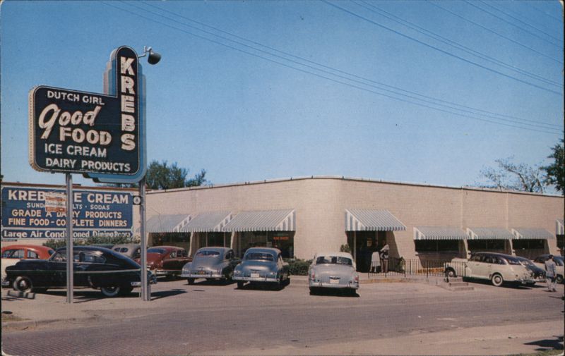 Exterior view of the Krebs Dutch Girl restaurant, with vintage automobiles parked in front. The signs advertise Good Food, Ice Cream, and Dairy Products. The restaurant served breakfast, lunch, and complete dinners, specializing in malts, sundaes, and sodas, and offered 28 flavors of ice cream and sherbets. It was located at East 1st Ave. and 29th St., on Highways 64 and 151. |