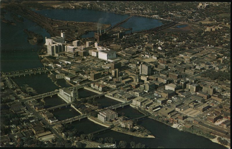 An aerial view of Cedar Rapids, Iowa, shows Municipal Island and the Quaker Oats plant. On the unique battleship form Municipal Island are the Chamber of Commerce Building, the City Hall and the Linn County Court House.