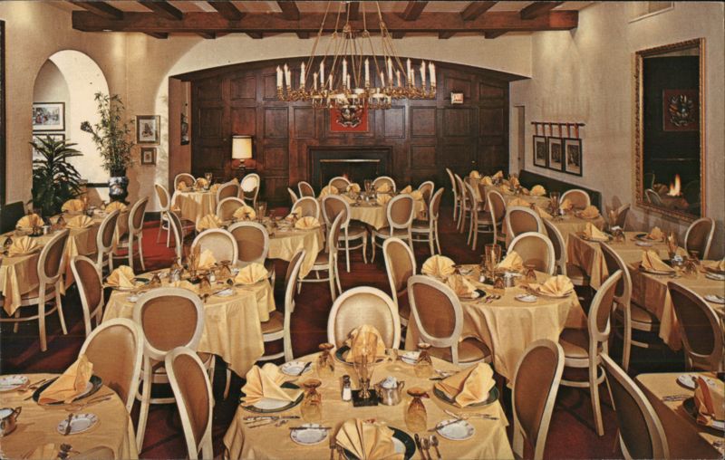 Interior view of The Meridian Room restaurant, showing tables set with yellow tablecloths and napkins. The room features dark wood-paneled walls, a large fireplace, and an ornate chandelier.