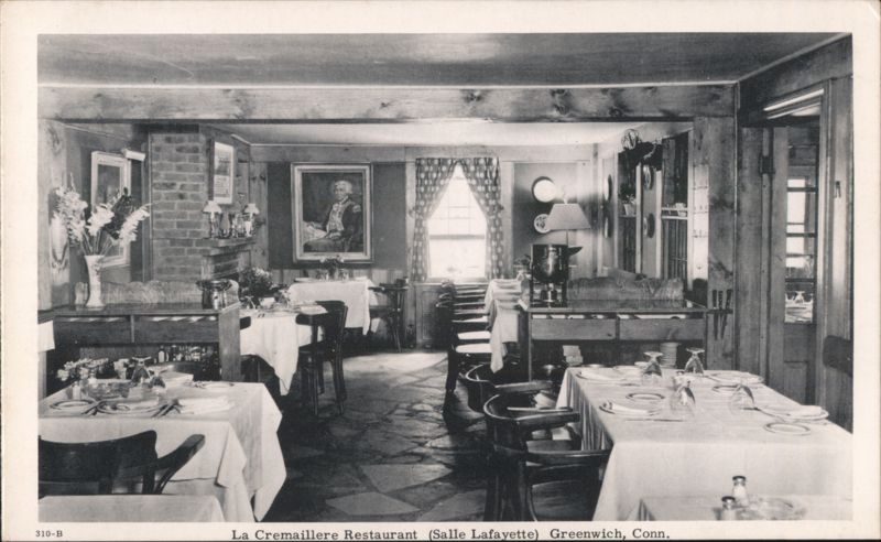 | Interior view of the Salle Lafayette dining room, featuring a rustic decor with exposed wooden beams, a flagstone floor, a brick fireplace, and dining tables set with white tablecloths. A portrait of the Marquis de Lafayette hangs on the far wall. |