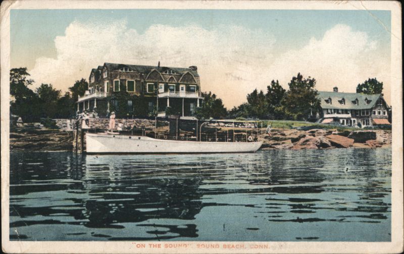 A long white motorboat is docked along a rocky shoreline in front of a large, dark shingle-style house. Another house is visible to the right, further back among the trees. The scene is reflected in the water in the foreground.