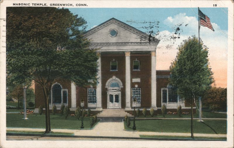 Exterior view of the Masonic Temple, a brick building with a classical revival facade featuring a portico with four large columns. An American flag flies on a pole to the right.