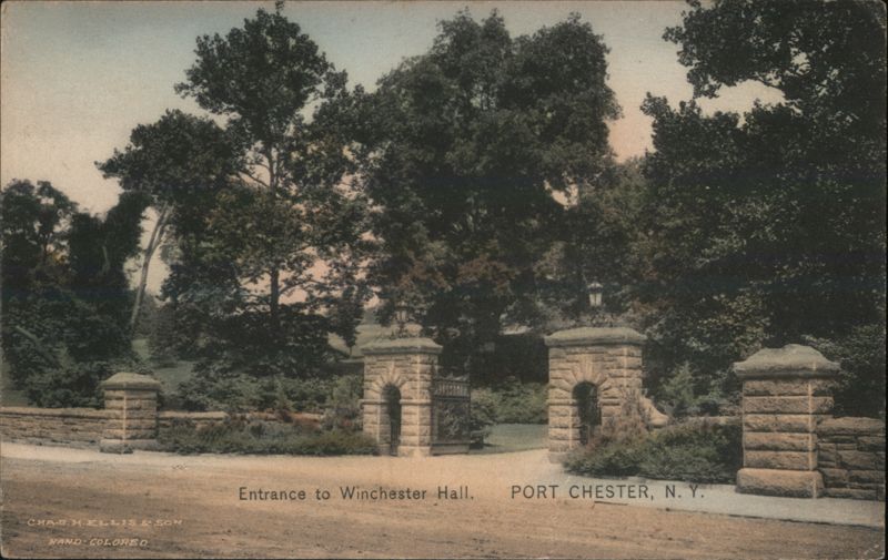 Hand-colored view of the stone and wrought iron gates at the entrance to Winchester Hall. An unpaved road leads to the entrance, which is surrounded by lush trees.