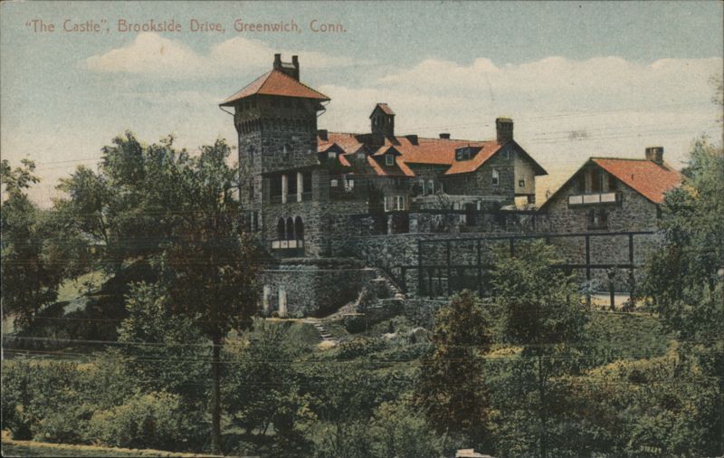 A view of a large, rustic stone house with a prominent round turret and red-tiled roof, known as "The Castle". The building is set on a landscaped, wooded hill.
