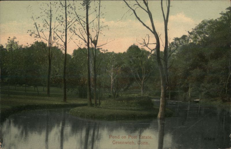 A tranquil scene of a pond with reflections of bare-branched trees on a grassy bank. A small spit of land with several tall trees juts into the water. A dense forest lines the background under a pale, colored sky.
