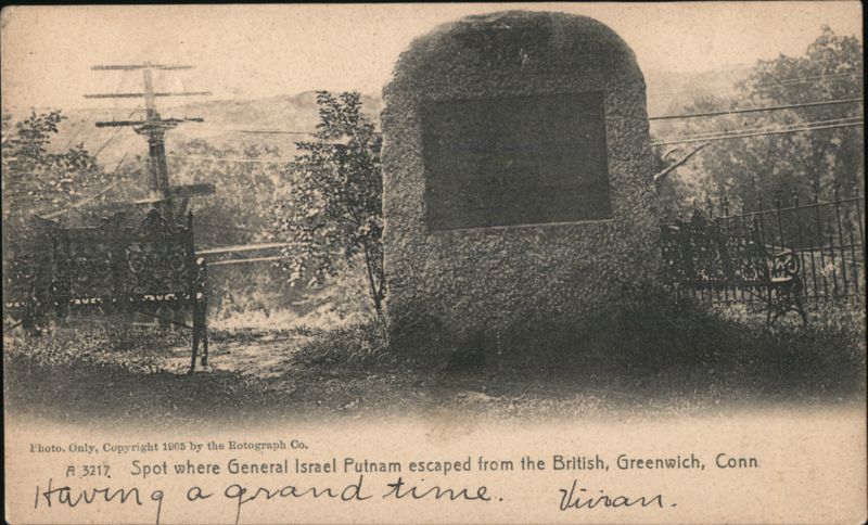 | Monument marking the historic spot of General Israel Putnam's escape from the British. The large, rough-hewn stone marker has an inset plaque and is located behind a decorative wrought-iron fence. A handwritten note reads: "Having a grand time. Vivian." |
