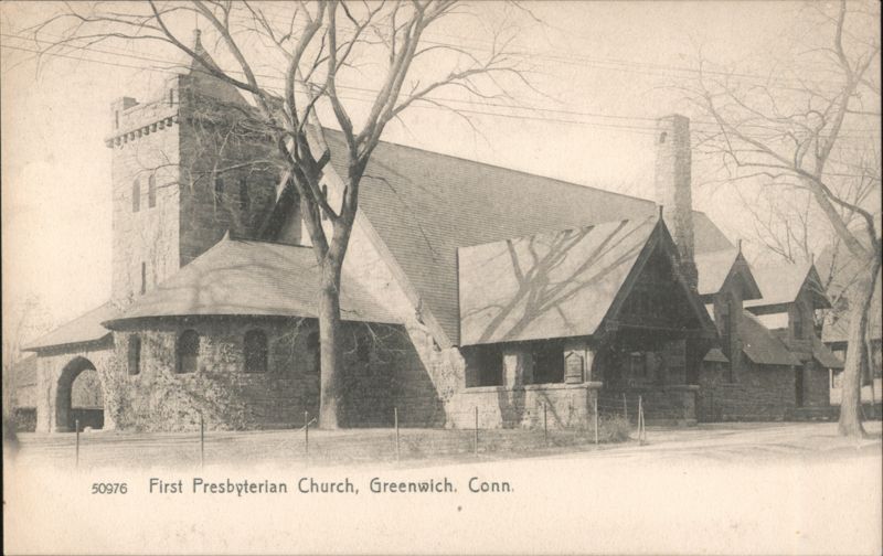 Exterior view of the First Presbyterian Church. The stone building features a prominent square bell tower, a round apse, and a large gabled roof. Bare trees are visible in the foreground.