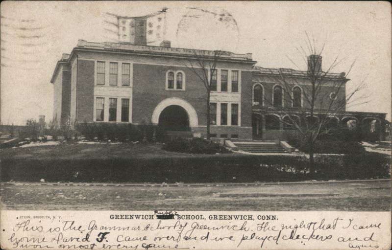 Handwritten message reads: 'This is the Grammar school of Greenwich. The night that I came home Jared F. came over and we played checkers and I won almost every game.' The postcard is addressed to Master Frederick Weed, West Granby, Conn.