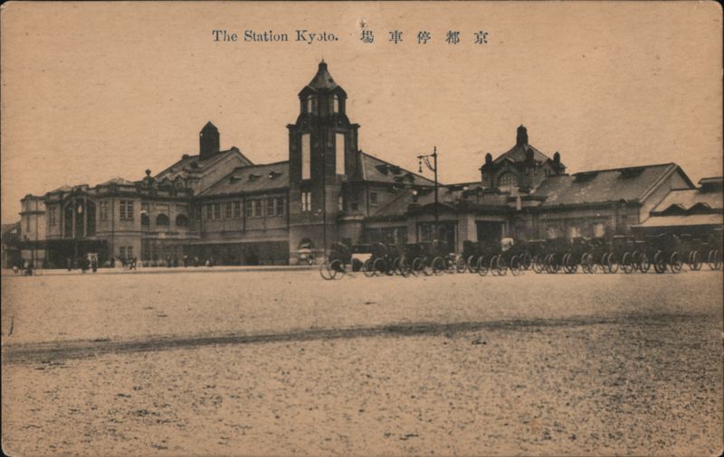 View of the second Kyoto Station building, a Renaissance-style brick structure built in 1914. A long line of rickshaws is waiting in the foreground plaza.
