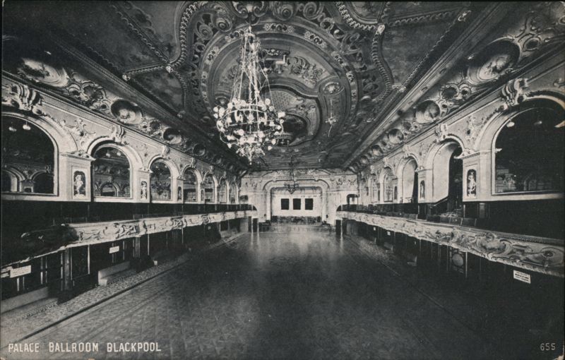 An interior view of the grand and ornate Palace Ballroom, showing its decorated ceiling, elaborate balconies, large chandeliers, and expansive polished dance floor.