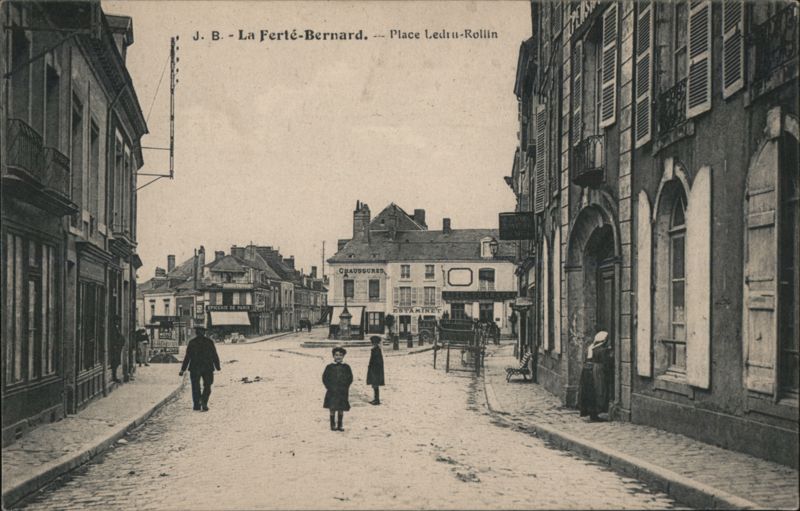 | A cobbled street view of Place Ledru-Rollin. Pedestrians, including a man and two children, are on the street. Buildings with shops line the road, with signs for "CHAUSSURES" (Shoes) and "ESTAMINET" visible. A woman wearing a coif stands in a doorway on the right. |