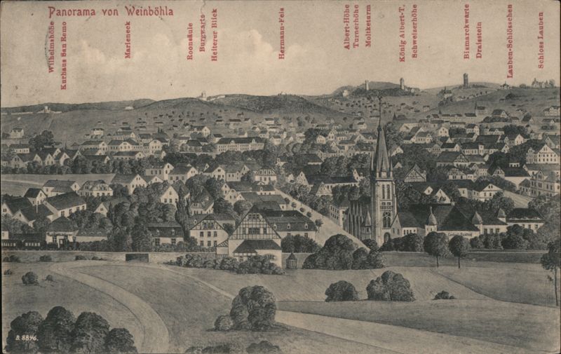 | A panoramic view of the town of Weinböhla, with hills in the background. A church with a tall steeple is prominent in the center. The surrounding hills and specific locations on them are labeled, including Wilhelmshöhe, Bismarckwarte, and Schloss Lauben. |