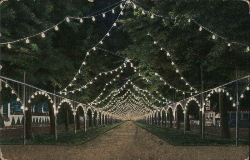 A long, tree-lined path at night, lit by strings of lights hanging from arches, for the International Hygiene Exhibition of 1911.