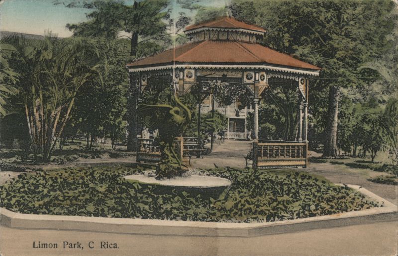 A central gazebo with a red roof is surrounded by lush tropical trees and plants. In the foreground, there is a fountain with a sculpture of a large bird with outstretched wings.