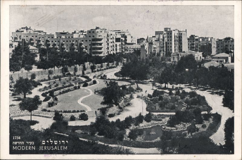 A view of a landscaped park with winding paths and gardens, with modern apartment buildings in the background.