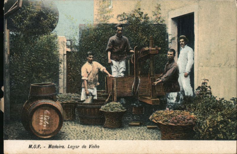 Men making wine using a traditional 'Lagar de Vinho' (wine press). One man stomps grapes in a vat while another operates the press. Baskets of grapes and a large barrel dated 1900 are visible.