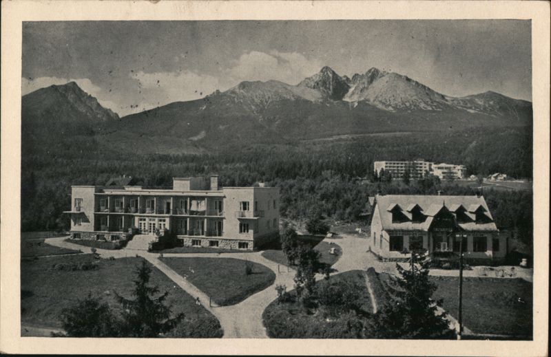 A view of two buildings, the Spišský dom and the 'Morava' pension, with the High Tatras mountains in the background.