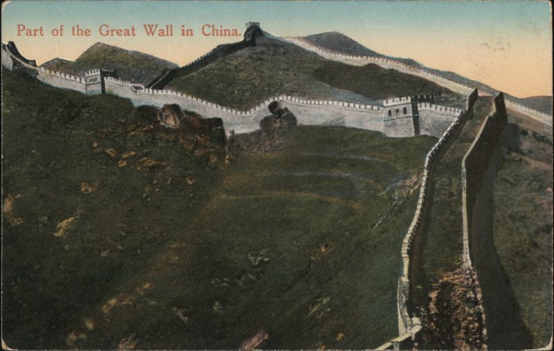 A view of the Great Wall as it winds its way over rolling green hills. Several watchtowers are visible along its length.