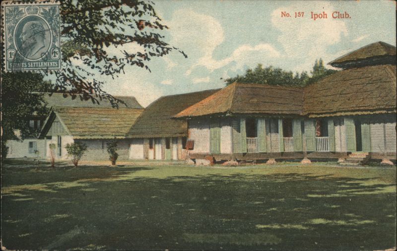 View of a colonial-style building with a large lawn in the foreground. A Straits Settlements one-cent stamp is affixed to the upper left corner.