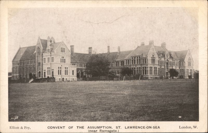 A view of the large, multi-winged Convent of the Assumption building from across a large grassy field, near Ramsgate.
