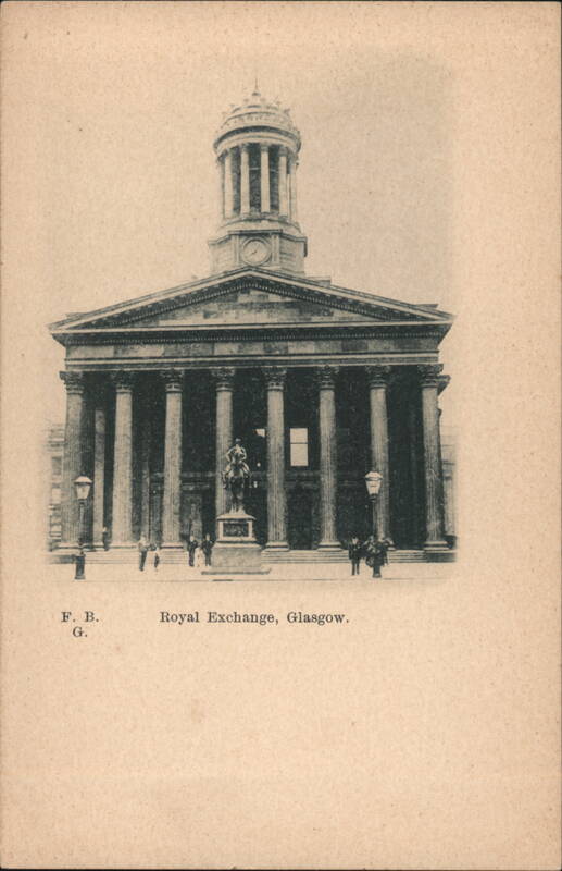 View of the Royal Exchange building, a neoclassical structure with a prominent colonnaded portico and clock tower. An equestrian statue stands in the foreground on a plinth.