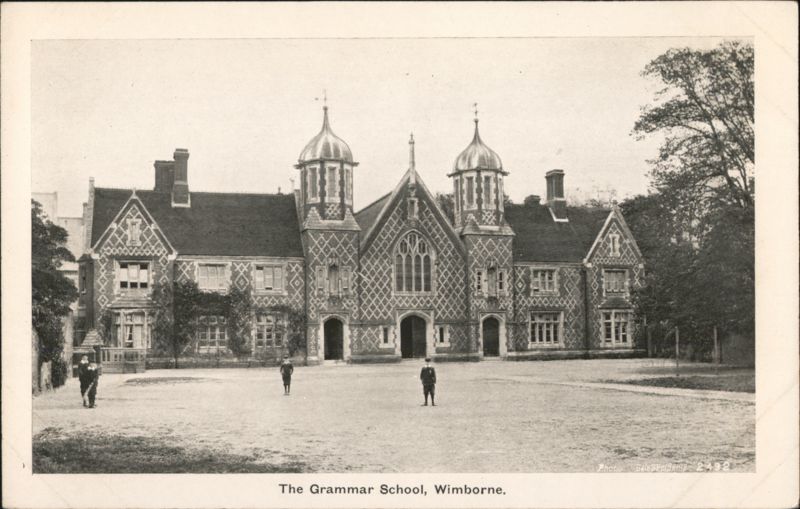 Exterior view of the school building, featuring distinctive diamond-patterned brickwork and two towers with cupolas. Three schoolboys stand in the large yard in front.