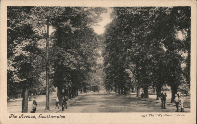 A wide, tree-lined road with pedestrians strolling along the sidewalks under a canopy of large, leafy trees.