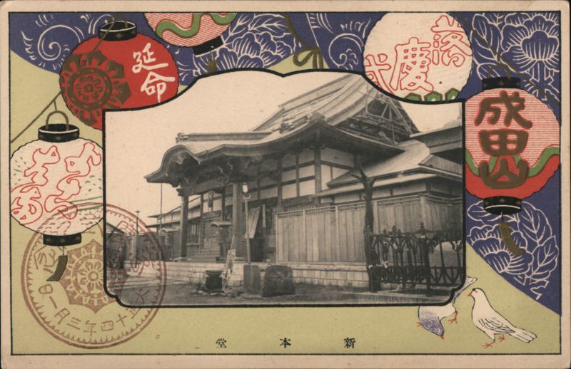 View of the Shin-Hondō (New Main Hall) of the temple. The image is framed by a decorative border of colorful chochin (paper lanterns) with inscriptions including 'Narita' (成田), 'Enmei' (延命), and 'Fudō' (不動), against a blue floral background. Two white doves are in the lower right. |