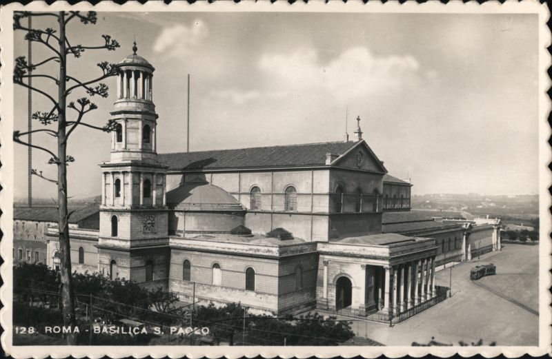 View of the Basilica of Saint Paul Outside the Walls, focusing on the side and the campanile (bell tower). A tree is in the left foreground and a small vehicle is visible on the road to the right.