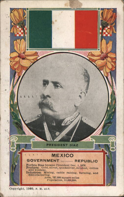 Portrait of President Porfirio Diaz of Mexico. The card includes information about Mexico's government, products, industries, area, and population. The flag of Mexico is displayed above the portrait.