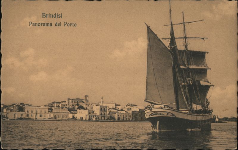 A large sailing ship is anchored in the harbor with the cityscape of Brindisi visible along the waterfront in the background. The scene provides a panoramic view of the port.