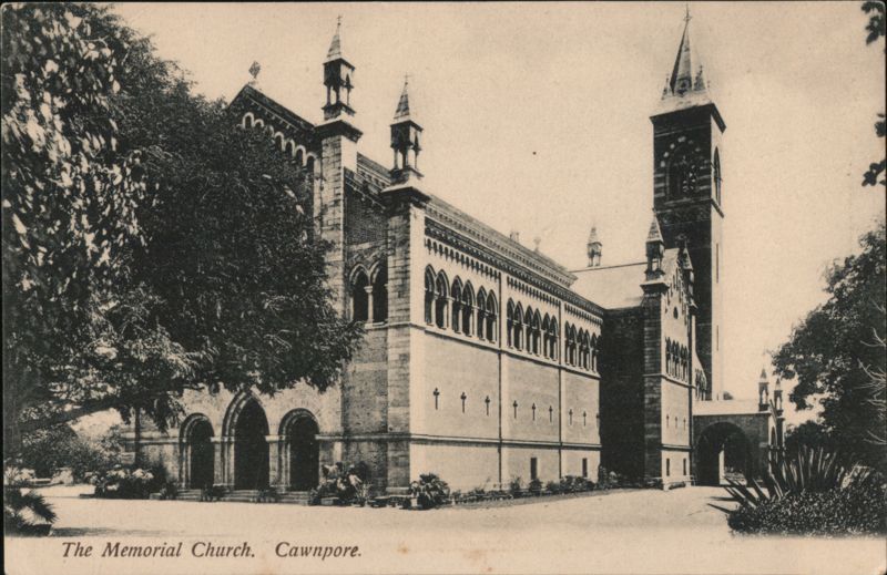 The large stone church features Gothic Revival architecture with arched windows, pinnacles, and a prominent clock tower. A large, leafy tree is in the foreground on the left.