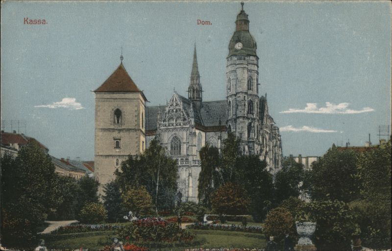 View of St. Elizabeth Cathedral (Dóm) and the separate St. Urban's Tower, seen from a park with trees and flowerbeds.