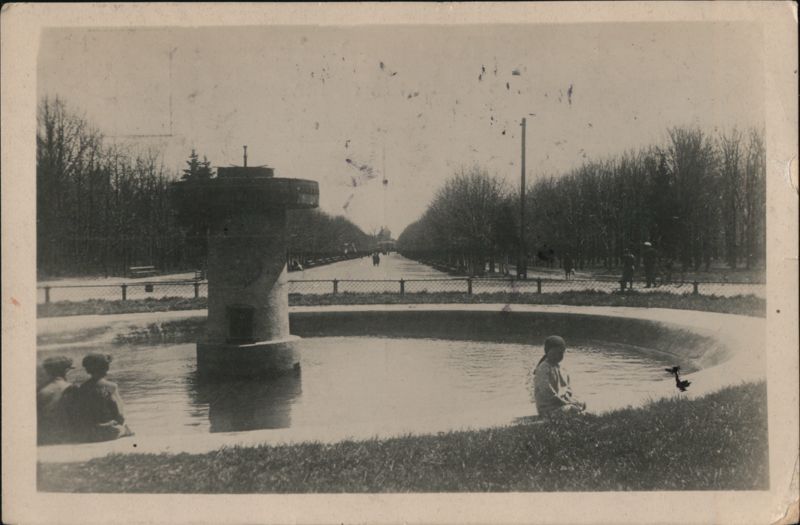 View of a long, tree-lined avenue in the city park with a circular fountain in the foreground. A small stone tower stands in the center of the fountain. People are seen sitting by the fountain and strolling down the avenue.