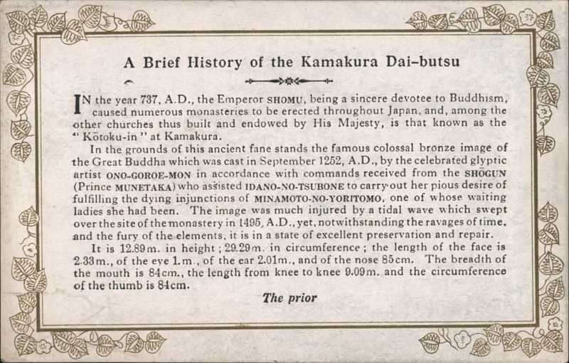 Text describing the history and dimensions of the colossal bronze statue of the Great Buddha (Daibutsu) located at the KÅtoku-in monastery. According to the text, the statue was cast in 1252 A.D. by artists Ono-Goroe-Mon and Idano-No-Tsubone. The statue's height is listed as 12.89 m and circumference as 29.29 m. |