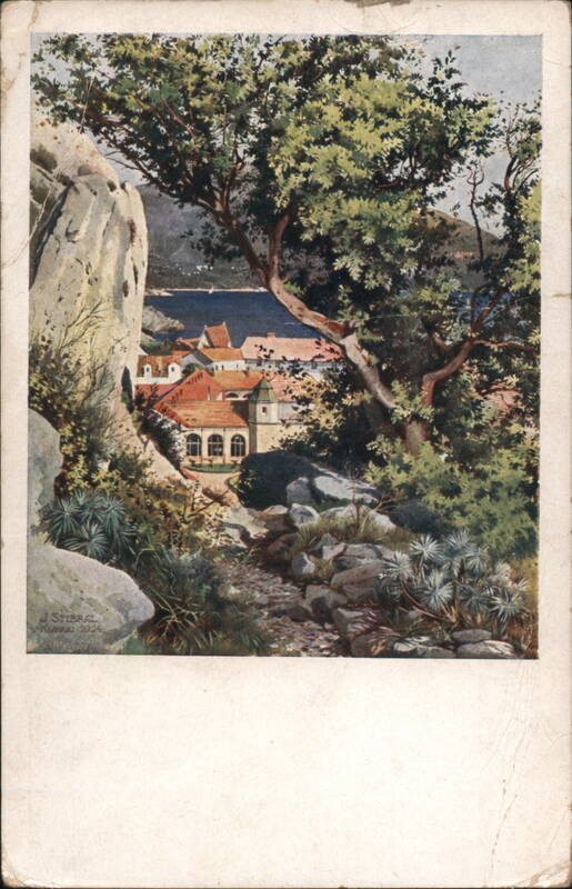 A painted view of the coastal resort town of Kupari, seen from a rocky, tree-covered hillside, overlooking the Adriatic Sea. The buildings have red-tiled roofs.